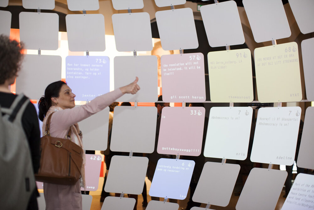 BeDemocracy was a participatory exhibition exploring democracy and the influence of social media on democratic engagement. Visitors actively shaped the content of the exhibition througout its 6-month run, creating a dynamic experience fully guided by visitor participation, in person and remotely.