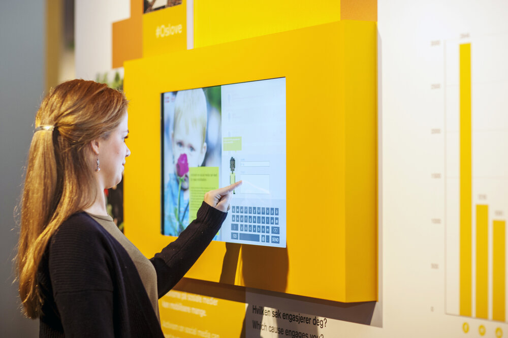 A central element of the exhibition was for visitors to experience the sense of "authority" that lies in expressing opinions on social media. They did this by giving their input via responding to topical questions on four thematic walls, digitally on the exhibition's website - or on Twitter. At the center of the exhibition was a giant sphere displaying these statements. With the help of Kinect motion sensing technology, visitors could "like" the expressions displayed on the sphere by giving a thumbs up, pushing the most liked ones to the forefront. In this way, visitors both created and continuously "edited" the content of the exhibition. Participation was overwhelming, with both a high visitor turnout physically, and over a million Tweets generated related to the exhibition's content.